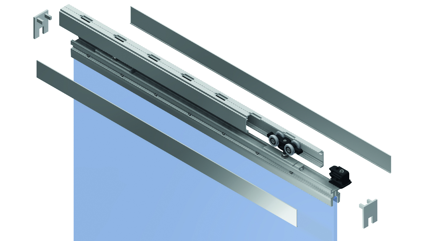El cristal no requiere mecanizado ni taladrado. El sistema tiene una capacidad de carga máxima de 100 kg. Incluye barra de tracción específica y tope adicional en la apertura.