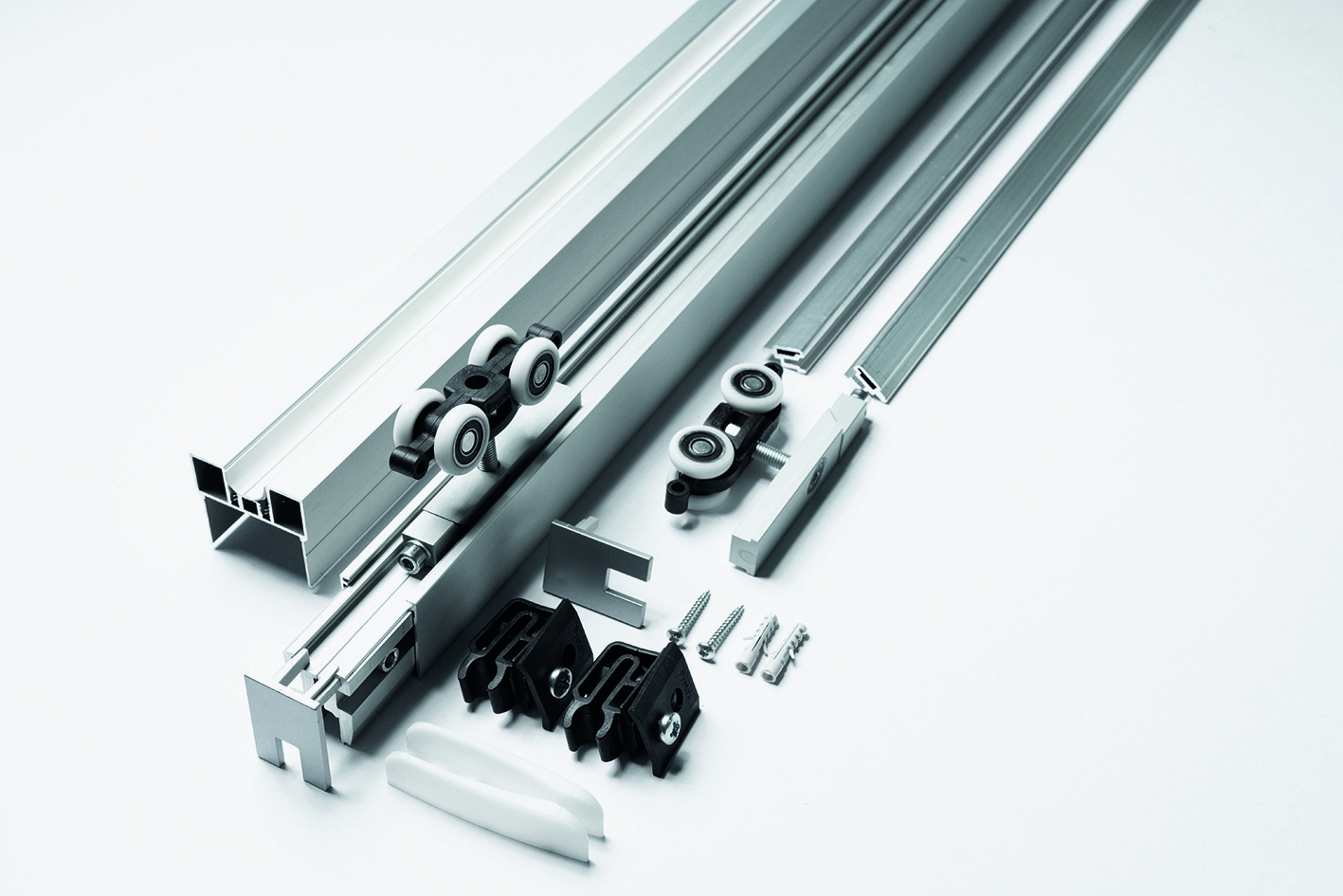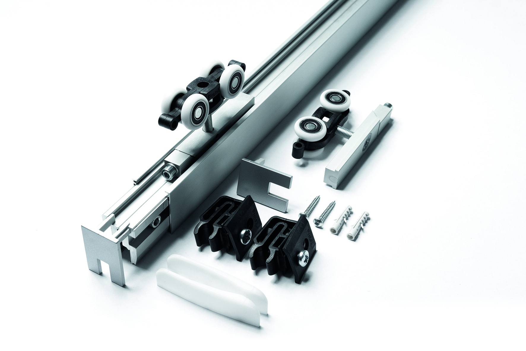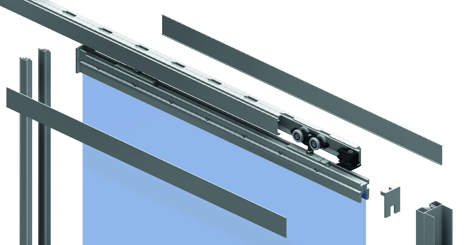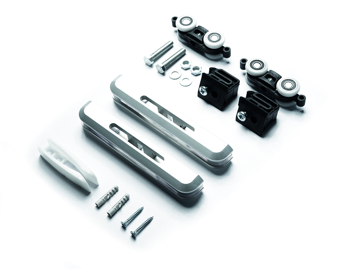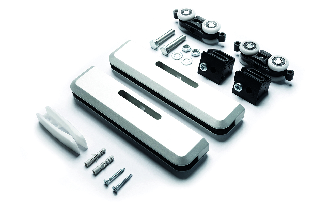 Incluye timón específico, tope adicional en la apertura, elemento de enclavamiento de aluminio anodizado para puertas de cristal completo con juntas y kit reductor de holgura.