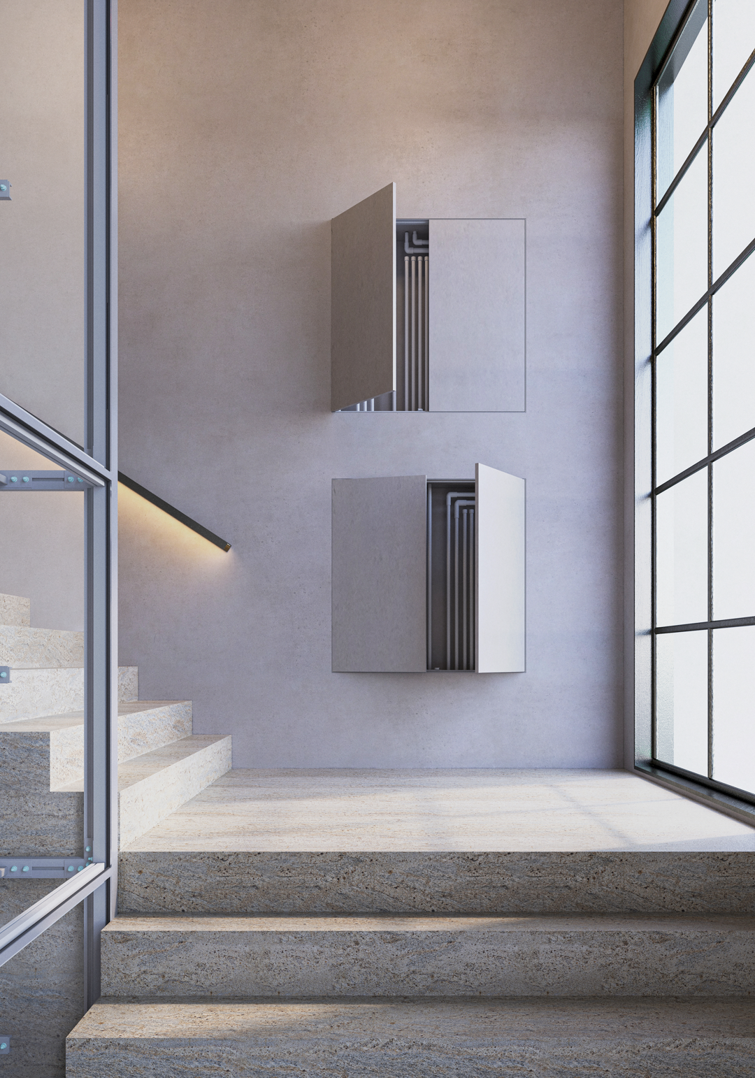 Mira 45 è la chiusura tecnica filomuro per parete finita 45 mm, composta da telaio in in alluminio anodizzato e pannello in truciolare nobilitato bianco spessore 19 mm con bordo in ABS bianco sui quattro lati.